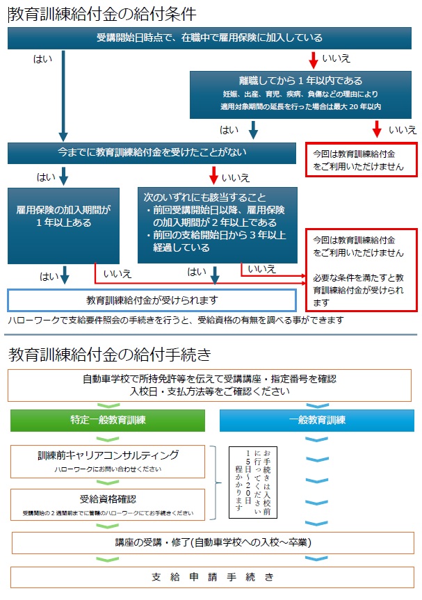 |    下記のフローチャートで教育訓練給付金が利用できるかのチェックができます。 ですが、このチャートはあくまで簡易版ですので、 実際にご利用になられる際は、最寄りのハローワークにお問い合わせください。 ![]() ※特定一般は受給資格確認前に入校すると対象外となります。 入校できる日付はハローワークのご担当者様へ必ずご確認ください。  |